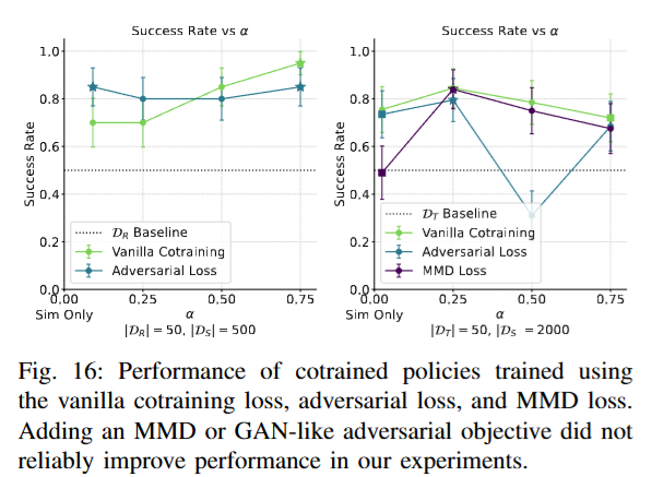 시뮬레이터 격차를 줄이는 또 다른 접근으로 정책 신경망의 표현 공간에서 두 도메인의 분포를 가깝게 만드는 방법도 진행해봤다고 합니다. GAN 형식으로 도메인 분류기를 학습해 표현이 어느 도메인인지 맞추지 못하도록 정책을 학습하는 방법과 표현 분포 간 MMD 거리를 계산해 최소화하는 방법을 시도해봤는데, 아래 figure 16과 같이 기존의 vanilla co-training보다 일관되게 높은 성능을 보이지는 않았다고 합니다. 다만 아직 시도되지 않은 다른 표현 정렬 방식 중에는 기본 공동학습보다 나은 성능을 낼 가능성도 배제할 수 없다고 언급하면서 시뮬레이터 자체의 개선이 아닌 표현 공간에서 도메인 격차를 줄이는 방향은 여전히 흥미로운 연구 주제라고 언급했습니다. X-sim에서는 real과 sim간의 rollout시의 observation 기준으로 DP의 인코더를 contrastive learning 했다고 했는데 비슷한 맥락인건가..?는 조금 고민을 더 해봐야 할 것 같습니다.
