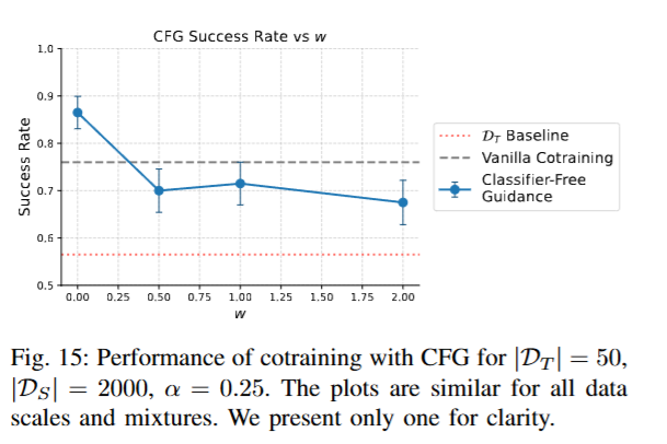 저자들은 앞서 얻은 인사이트를 바탕으로 환경에 따른 행동 차이를 샘플링 단계에서 의도적으로 증폭시키는 Classifier-Free Guidance를 적용해 환경의 one hot 벡터를 추가하고 실험을 진행했는데, 아래 figure 15와 같이 해당 조건의 영향을 증폭하지 않았을때는 성능이 조금 증가했지만 오히려 w값을 높여서 증폭을 하는 경우에는 vanilla co-training 방법보다 성능이 나오지 않았다고 합니다.