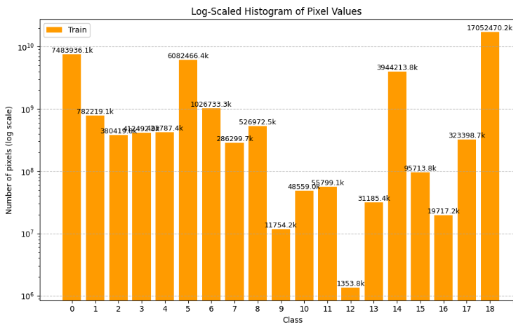 - 클래스의 분포가 상이하여 long-tail 문제가 있었습니다. 아래는 클래스별 픽셀 수를 나타낸 그래프입니다(log scale)
