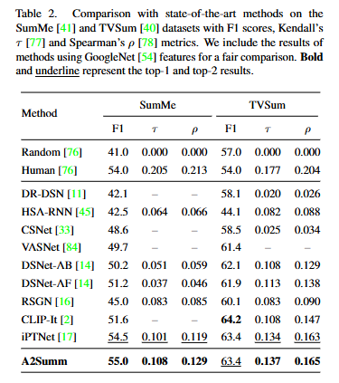 Table2결과에 따르면 A2Summ은 기존 SOTA 방법들과 비교했을 때 SumMe와 TVSum 데이터셋 모두에서 우수한 성능을 달성했습니다. 특히 순위기반 지표에서 높은 상관도를 보임으로 중요 구간의 정확한 탐지 능력을 가지는 것을 알수 있습니다.