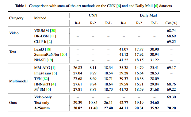 Table 1은 멀티모달 요약 결과를 보여줍니다. ROUGE F1 점수와 비디오–텍스트 간 코사인 유사도 모두에서 A2Summ이 alignment-guided attention과 dual contrastive loss를 통해 두 모달리티의 정보를 효과적으로 학습하여 기존 방법들을 전반적으로 능가하는 성능을 보였습니다.