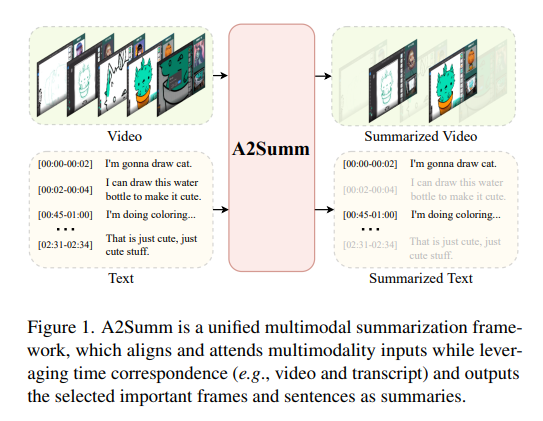 • multimodal summarization이란? 하나의 입력이 영상과 텍스트처럼 서로 다른 형태(모달리티)를 가질 때 각 모달리티의 정보를 결합하여 중요한 부분만을 추출하고 요약을 생성하는 모델을 말합니다.