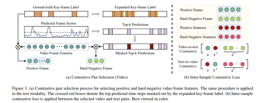 비디오 요약 task에서는 긴 영상속에서 배경 프레임이나 덜 관련된 문장을 배제하는것이 핵심이기 때문에 동일한 샘플 내에서도 대조학습을 수행합니다.