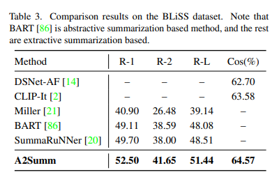 Table3은 새로 제안한 BLiSS데이터셋에서의 비교 결과를 보여줍니다. A2Summ은 결과로 확인할 수 있듯이 라이브스트림 같이 길고 복잡한 데이터셋에서도 대표적인 비디오 요약 기법과 텍스트 요약 기법 모두보다 높은 성능을 달성하는 것을 확인할수 있습니다.