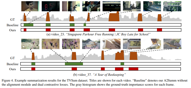 fig4에서 알수 있듯이 기존 모델들의 중요구간 누락이나 부정확한 예측 등의 문제를 A2Summ은 시간정렬 정보(temporal alignment)와 샘플 간&샘플 내 대조학습을 함께 활용함으로써 핵심 구간을 보다 정교하게 잡아낼수 있었습니다.