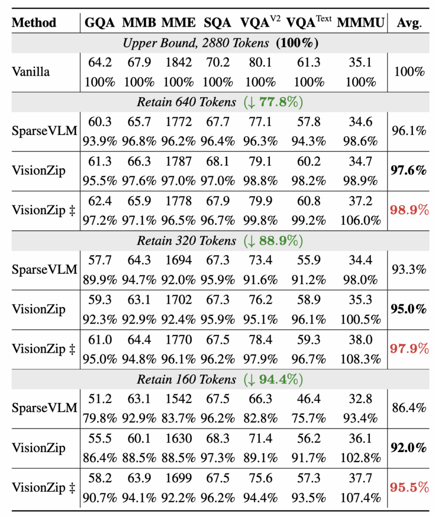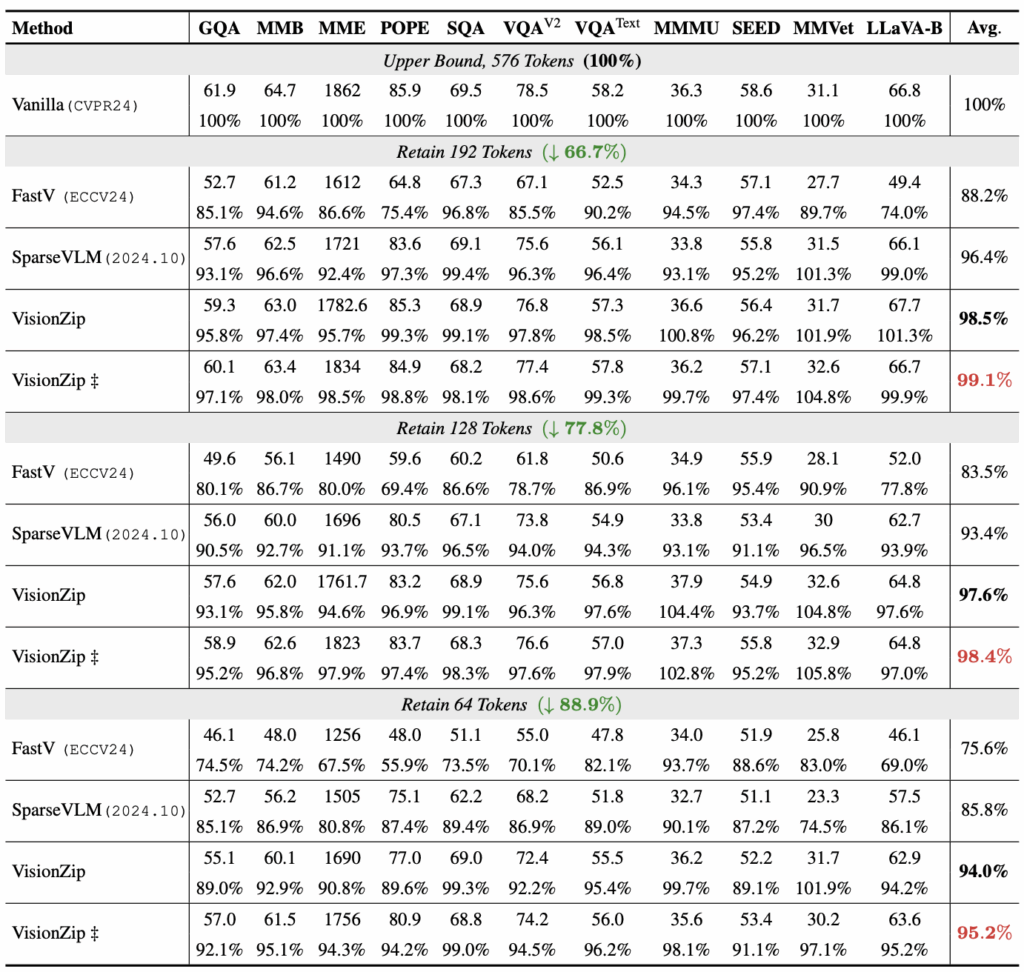 표 1은 LLaVA-1.5에 VisionZip 등 다양한 efficient 방법론을 붙였을 때의 벤치마크 성능입니다. 표에서 일반 ‘VisionZip’은 앞서 언급한 training-free 방식, ‘VisionZip\ddagger{}‘는 projector를 위한 fine-tuning 방식을 의미합니다. 또한 표에서 베이스라인인 Vanilla 성능은 이미지 당 576개의 토큰을 활용할때이며, 벤치마크마다 성능 비교가 어려우니 바닐라의 성능을 100%로 두었을때 각 방법론의 상대적 성능을 %로 표기하고 있습니다.