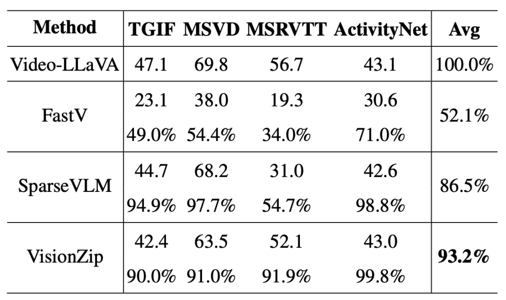 표 3은 Video-LLaVA 모델에 efficient VLM 방법론을 적용했을때의 벤치마크 성능 표입니다. 바닐라 Video-LLaVA는 한 프레임 당 256개, 총 8개 프레임을 추출하며 결국 한 비디오 당 2,048개의 비전 토큰을 쓰고, 나머지 방법론들은 이를 136개로 줄였을 때의 성능에 해당합니다. 한 프레임의 256개 토큰을 17개로 줄여 8개 프레임을 붙이는 방식을 사용한 것입니다. VisionZip training-free 방식에서도 바닐라 성능 대비 93.2%의 성능을 보여주며 동일 조건에서 타 방법론보다 적은 성능 하락폭을 보여주었습니다.