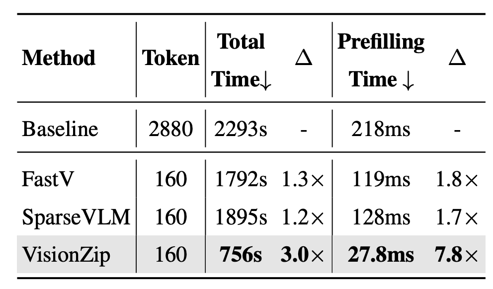 다음으로 그림 2-(b)는 모델의 prefilling time을 보여주고 있습니다. VLM은 답변을 ‘generate’하고, 실제 이 generate는 (‘입력된 비전 토큰’ + ‘자연어 토큰’ + ‘지금까지 모델이 만들어 낸 답변 토큰’)을 입력하여 한 단어씩 만들어내는 ‘forward’의 반복 과정이라 생각해주시면 됩니다. 결국 이 과정 중 앞단에 있는 토큰에 대해서는 동일한 forward가 반복되기에 이를 KV cache에 저장해두고 반복함으로써 효율성을 높여줍니다. 여기서 prefilling time은 가장 첫 반복 시기에 KV cache에 값을 채우는 데 소요되는 시간으로 실제 모델의 효율성과 직결된다고 보시면 됩니다. VisionZip 방식으로 비전 토큰 개수를 크게 줄이며 이 prefilling time이 8배 감소되었음을 강조하고 있습니다.