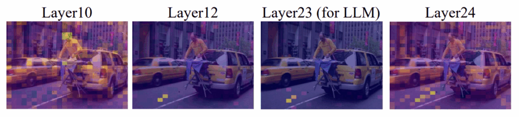 위 그림 5는 VLM layer에 따른 attention 분포 시각화 입니다. 초반에는 여러 토큰에 걸쳐 attention이 뿌려져있지만, 뒤로 갈수록 소수 토큰에 집중하다가 마지막 24번 레이어에서는 다시 흩어지는 것을 볼 수 있습니다. CLIP과 같은 비전 인코더는 텍스트와의 대조학습을 기반으로 임베딩 공간이 형성되어있다보니, 마지막 24번 레이어는 텍스트와의 대조학습을 위해 임베딩 공간이 형성되어있어 attention 정보가 너무 산발되어있거나 너무 소수에만 집중되어있는 문제가 있다고 합니다. 결국 24번 레이어에선 실제 입력 이미지의 정보를 담기보단 텍스트와의 대조학습을 준비하는 feature가 만들어지는 것이죠.