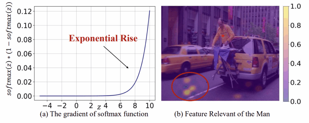 수식 (2)는 softmax의 gradient 수식이며, 아래 그림 6-(a)는 수식 (2)를 그래프로 나타낸 것입니다. 결국 softmax가 forward에 관여하면 z_{i}가 클수록 gradient는 지수적으로 증가, 작을수록 0에 가깝게 무시되는 속성이 있기에 정말 극소수의 토큰만 높은 attention을 할당받는 현상이 발생한다고 이야기합니다. 보통 학계에서 이야기하는 ‘Attention sink’와 동일한 현상이라고 볼 수 있습니다.