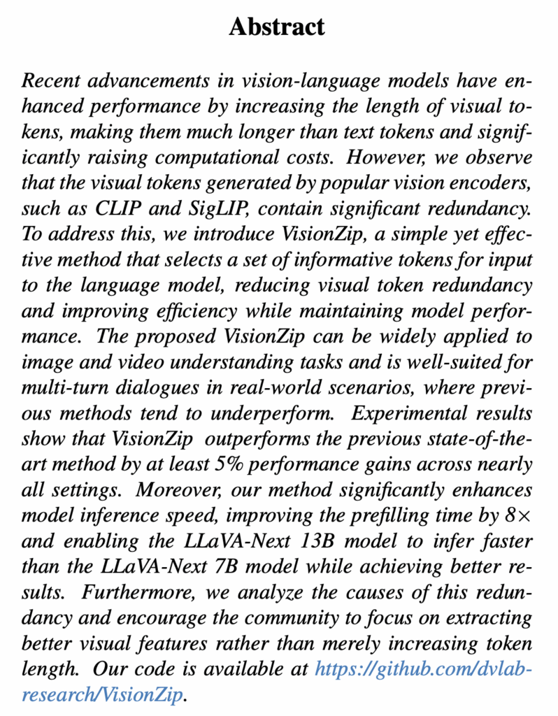 안녕하세요. 오늘의 X-Review는 25년도 CVPR에 게재된 VisionZip이라는 논문입니다. 제목에서도 알 수 있듯 VLM의 vision token efficiency와 관련된 논문이며, 개인적으로는 VisionZip의 방법론 자체도 좋지만 이 방법론의 필요성과 효과에 대한 설득력이 좋다고 느껴져 정리해보게 되었습니다. 바로 리뷰 시작하겠습니다.