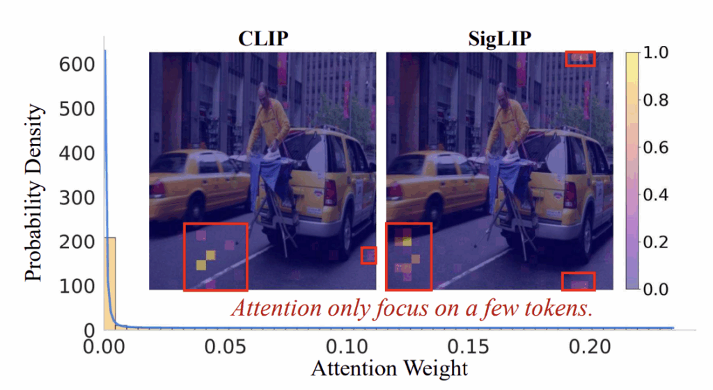 여기서도 마찬가지로 왜 기존 비전 토큰에는 redundancy가 존재하는지 설명합니다. 첫번째로는 대조학습 과정에서 비전 인코더가 CLS 토큰 등 정말 소수 토큰에만 집중해도 대조학습이 잘 되는 일종의 ‘shortcut’을 발견한 것이라고 저자는 주장합니다. 더 큰 원인으로는 softmax를 꼽고 있습니다.
