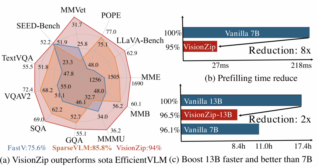 마지막으로 그림 2-(c)는 LLaVA-NeXT 13B 모델에 VisionZip을 적용해 추론하는 경우 성능은 상대적으로 떨어지나 이 성능이 Vanilla LLaVA-NeXT 7B 모델보다는 높은 성능을 달성하였고, 더욱이 빠른 추론 시간을 갖게되며 real-world로 나아가기 위해 적용해볼법한 좋은 방법론임을 강조하고 있습니다.