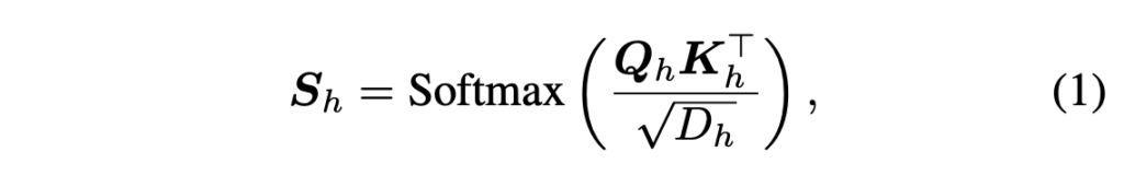 위 수식 (1)은 일반적인 attention 연산에서 attention 값을 추출하는 과정을 나타냅니다. \boldsymbol{Q}, \boldsymbol{K}는 연산의 쿼리, 키를 의미하며 D는 head의 차원입니다. 추가로 각 값 아래 붙어있는 h는 한 레이어의 head 인덱스를 의미하며, 최종적으로 dominant token을 결정할 attention 값은 head 축으로 평균낸 \boldsymbol{S}_{avg} \in{} \mathbb{R}^{B \times{} SeqLen \times{} SeqLen}입니다. 여기서 SeqLen은 sequence length로 전체 토큰 개수와 같다고 보시면 됩니다.
