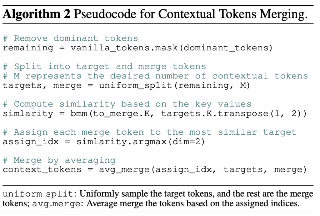 위 알고리즘 2가 해당 merge 과정을 보여주고 있습니다. remaining 변수에 dominant를 제외한 나머지 non-dominant token들을 담고, 기존의 token merging 방식과 유사하게 두 개의 집합으로 나눈 뒤 다른 하나의 집합 내 토큰 중 자신이 합쳐질 토큰을 argmax로 선택하게 됩니다. 이때 유사도는 self attention 과정에서 각 토큰의 정보를 이미 잘 요약하고 있는 키(K) 값을 기준으로 계산합니다. 이렇게 선택된 토큰과 자신을 평균내어 merging을 수행합니다. 최종적으로는 dominant token과 context token이 concat되어 projection layer에 입력됩니다.