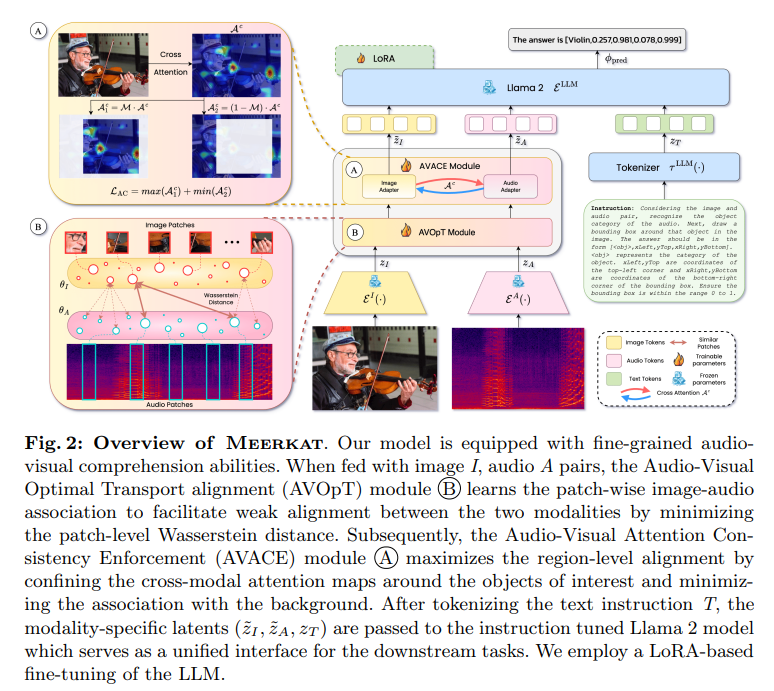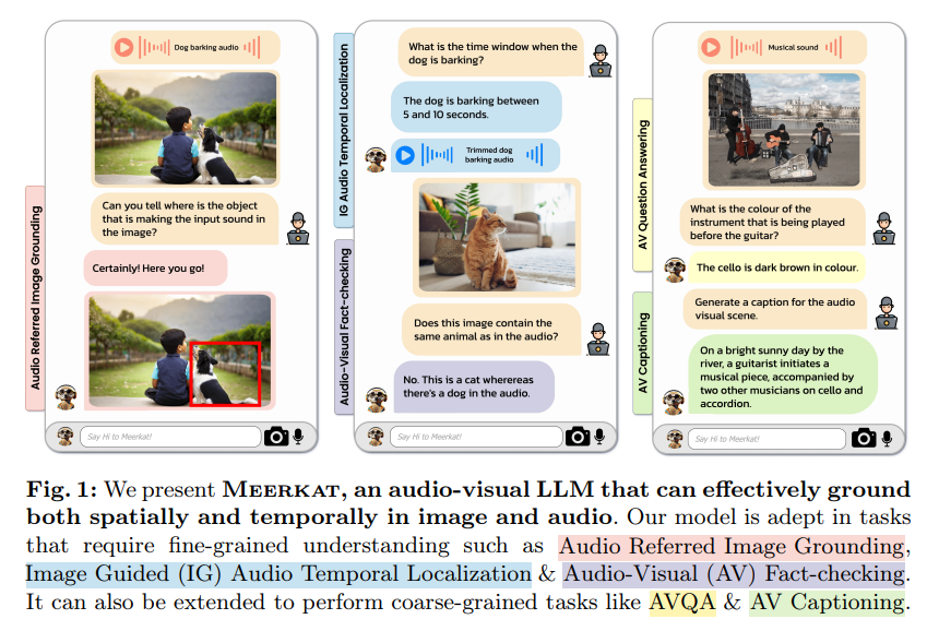 이러한 상황에서 Meerkat 이라는 이미지와 오디오 모두에서 각각 공간적, 시간적 grounding 을 수행할 수 있게한 최초의 통합 오디오-비주얼 LLM 프레임워크를 제안합니다.