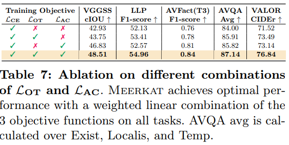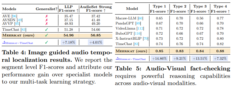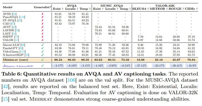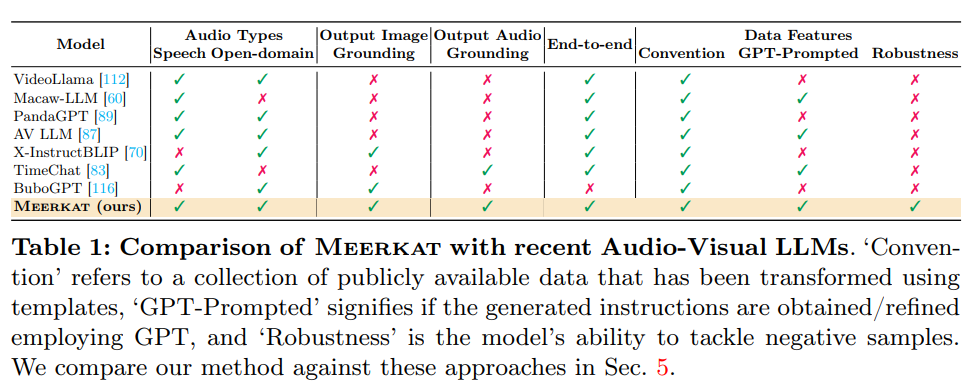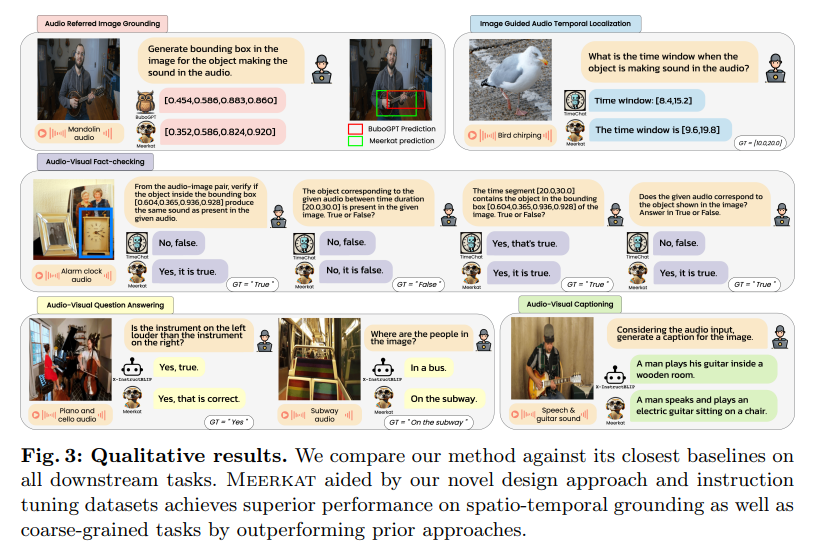 또한 저자는 공개 데이터셋들을 수집하여 300만개의 instruction-tuning 샘플들로 구성된 대규모 데이터셋 AVFIT 을 구축했고, 다섯 가지의 어려운 오디오-비주얼 task 들을 통합한 벤치마크인 Meerkatbench 를 제안한다고 합니다.