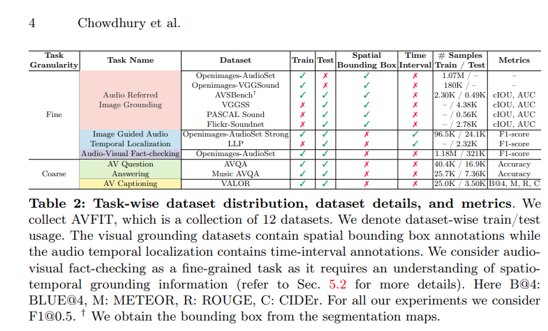 저자는 이러한 상황에서 5가지 태스크로 구성된 오디오-비주얼 통합 벤치마크를 제안하고 그중 Fine-grained task 3개와 coarse-grained task 2개를 구분합니다.