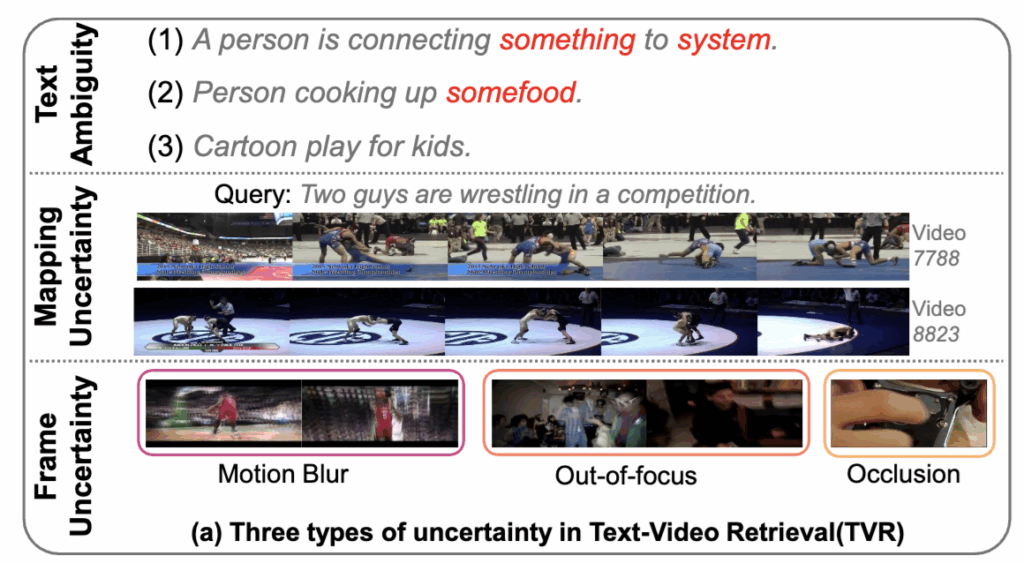 하지만 상단 그림 (a)와 같이, TVR은 여전히 세 가지 종류의 불확실성 때문에 어렵다고 합니다. (1) text query가 애매하거나 너무 일반적인 경우(“something”, “somefood”, “Cartoon play for kids” 등)에는 어떤 비디오를 찾아야 할지 목표가 불분명해지는 텍스트 모호성 (Text Ambiguity), (2) 문장은 충분히 구체적이더라도 여러 개의 비슷한 비디오가 동시에 후보로 뜨는 매핑 불확실성 (Mapping Uncertainty), (3) 모션 블러·아웃포커스·가림 현상처럼 프레임 자체의 품질이 나쁜 프레임 불확실성 (Frame Uncertainty)이 서로 얽혀 TVR 성능을 크게 떨어뜨린다고 합니다.