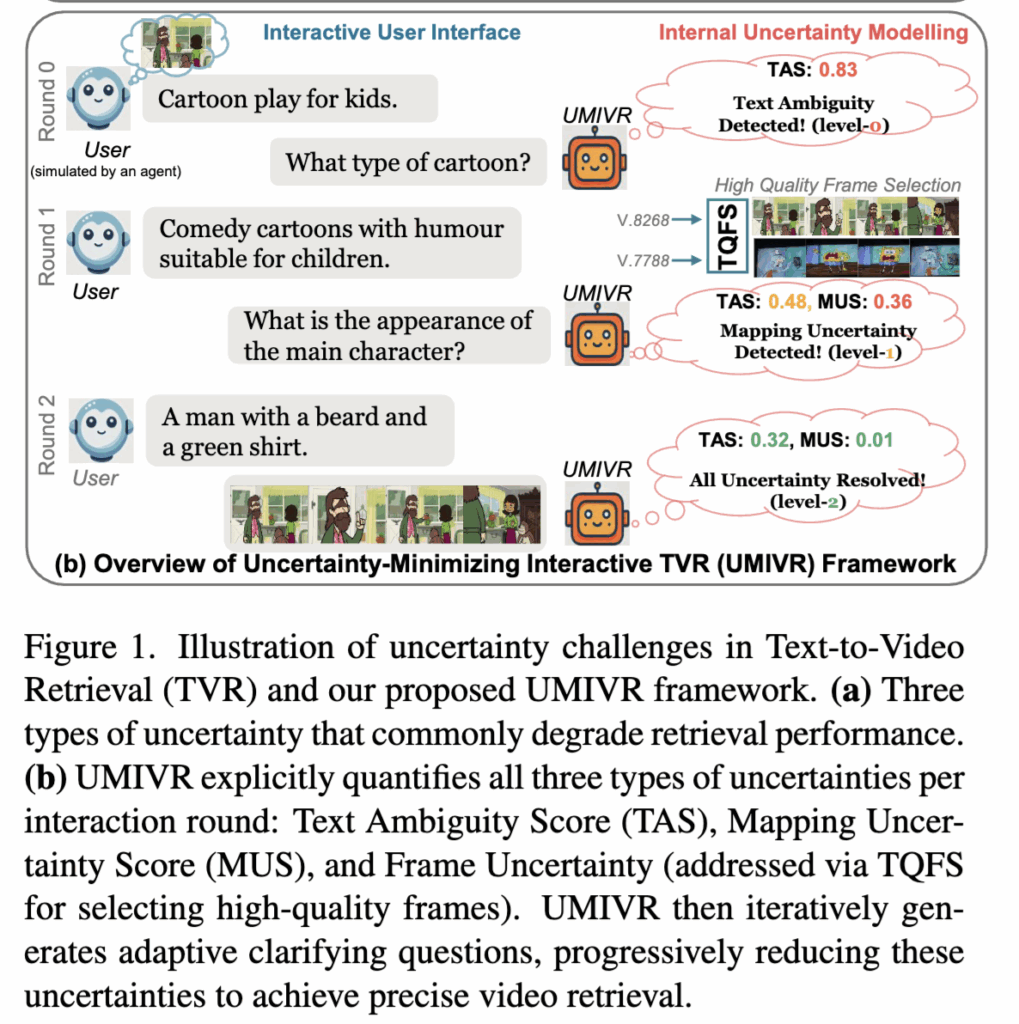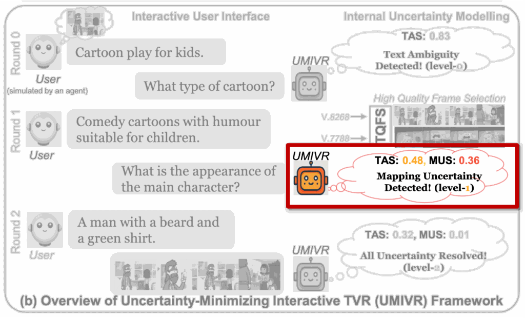 Fig. 1(b)에서는 저자가 제안하는 UMIVR(Uncertainty-Minimizing Interactive TVR)에 대해 나와있는데요, UMIVR 구조에서는 매 라운드마다 TAS와 MUS를 갱신하면서 어떤 불확실성이 남아 있는지 추적하고, 그걸 줄이기 위해 “어떤 종류의 만화인가요?”, “주인공의 외형은 어떤가요?”와 같은 명확화 질문을 적응적으로 만들어, 모호하고 노이즈가 많은 입력의 영향을 줄이면서 점점 더 정확한 비디오를 찾도록 설계했다고 합니다. 지금부터 자세한 방법에 대해 알아보겠습니다
