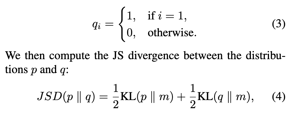 그 다음 비교 대상이 되는 이상적인 정답 분포 q 를 정의하는데, 이는 1개의 후보가 확실한 정답일 때의 one-hot 분포입니다. 즉, 완벽한 확신이 있는 상황을 기준으로 삼아, 실제 분포 p 가 이 이상적인 분포와 얼마나 벗어나는지를 JS Divergence 로 측정합니다.