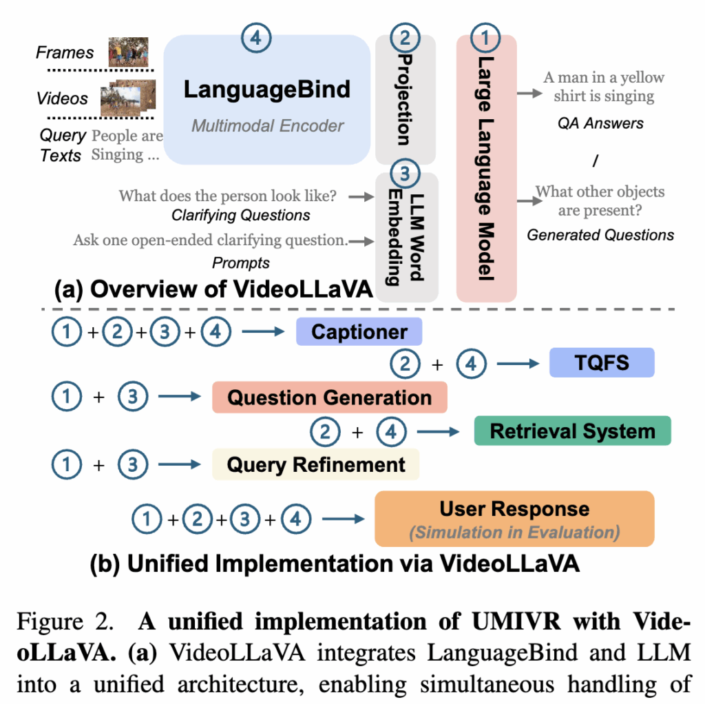기존 인터랙티브 TVR은 BLIP·ChatGPT 등 여러 모델을 따로 조합하는 형태가 많아 메모리 비용과 지연 시간이 컸습니다. 이를 해결하기 위해 UMIVR은 VideoLLaVA 기반 통합 모델을 사용합니다. (참고로 저는 인터랙티브 TVR 태스크를 처음 알았는데, 사용자와 소통하면서 관련 비디오를 더 정확하게 찾아주는 것이라고 합니다)