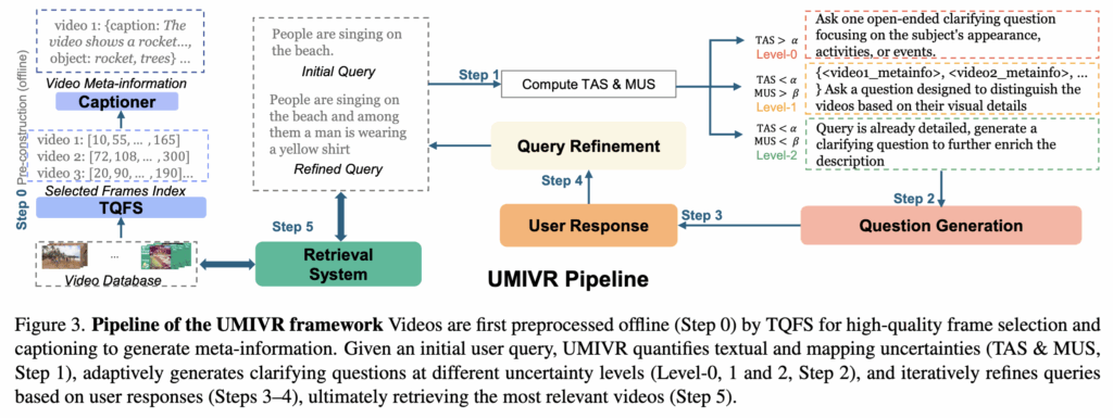 사용자가 질의를 입력하면, UMIVR은 먼저 query가 얼마나 애매한가(TAS)와 여러 비디오 중 어떤 것이 맞는지 구분이 어려운가(MUS)를 계산합니다.