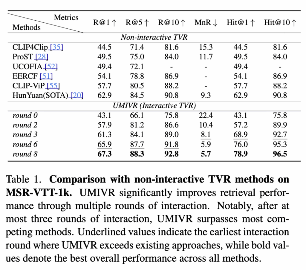 UMIVR은 MSR-VTT 실험에서 모든 interaction round 전반에 걸쳐 기존 인터랙티브 TVR 기법보다 꾸준히 우수한 성능을 보였습니다. 특히 단 3번의 라운드만 거친 시점부터 이미 비인터랙티브 SOTA였던 HunYuan-tvr을 Hit@1 기준으로 넘어서는 결과(68.9 vs. 62.9)를 기록하며, 불확실성을 단계적으로 줄여가는 인터랙티브 설계의 효과를 명확히 보여주었습니다.