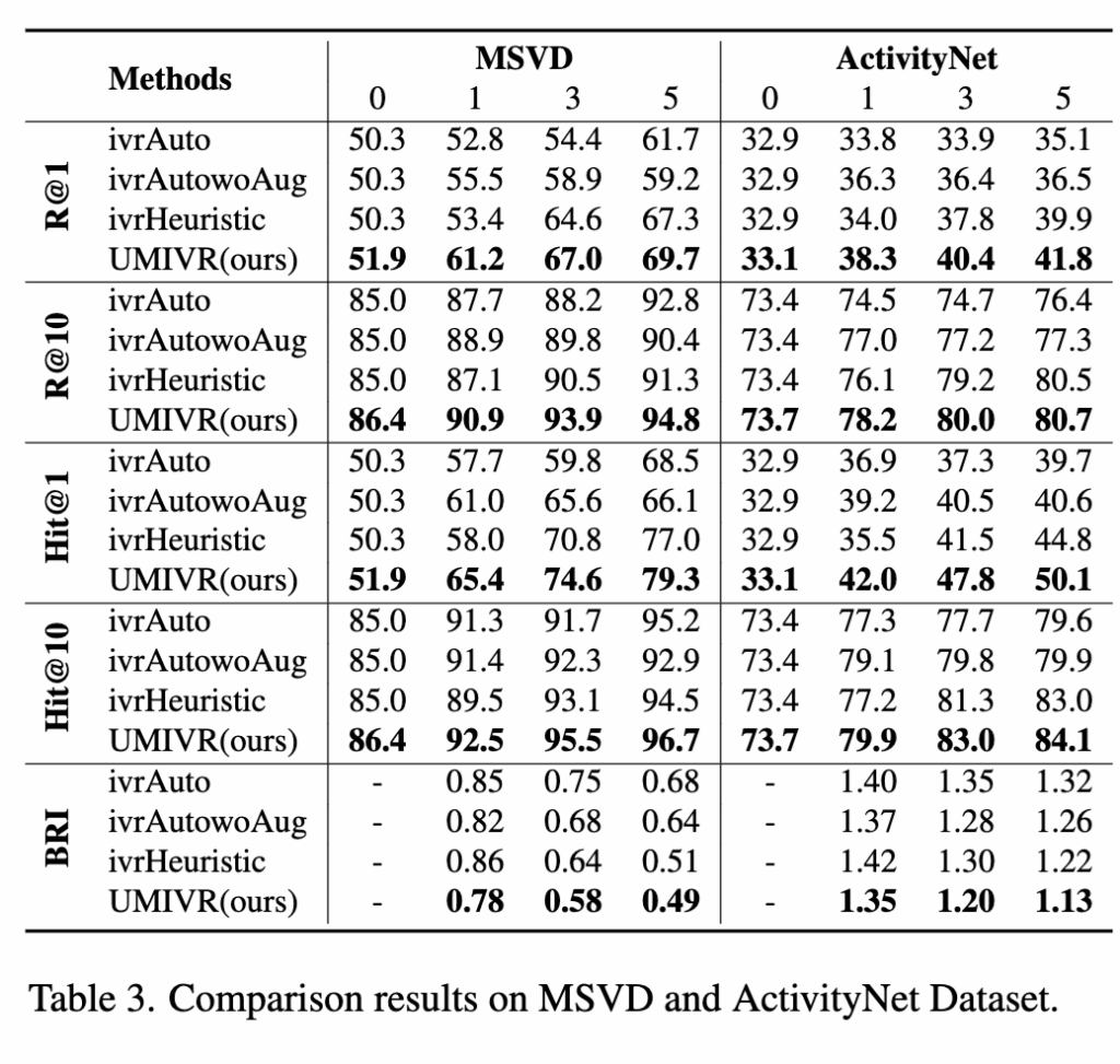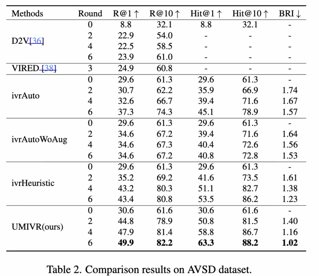 이후 AVSD, MSVD, ActivityNet에서도 UMIVR은 안정적인 성능을 보였습니다. AVSD 실험에서는 기존 IVR 계열 모델 대비 높은 R@1, R@10, Hit@1 성능을 달성하면서도 BRI에서도 가장 낮은 값을 기록해 적은 interaction으로도 성능을 확보하는 효율성을 보여주었습니다. 뿐만아니라, 상대적으로 데이터 규모와 특성이 크게 다른 MSVD·ActivityNet 실험에서도 모든 라운드에서 가장 높은 recall과 hit 성능을 달성하며, 제안한 방법이 다양한 종류의 비디오와 텍스트 조건에서도 일반화된다는 점을 확인시켰습니다.