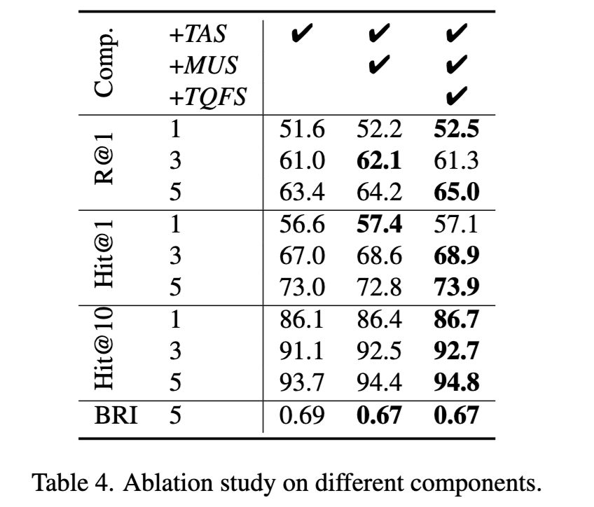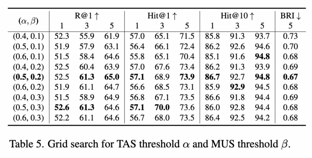 또한 저자들은 각 점수의 threshold 파라미터가 성능에 얼마나 민감한지 추가적으로 분석했는데요. Grid search 결과, TAS의 α = 0.5, MUS의 β = 0.2 조합이 가장 높은 Recall, Hit@1, Hit@10 성능을 보였으며, 동시에 BRI 지표에서도 가장 낮은(좋은) 값을 달성했습니다. 이 값에서 벗어날 경우 성능이 확연히 감소해, 두 파라미터를 신중하게 조정해야한다고 하네요.