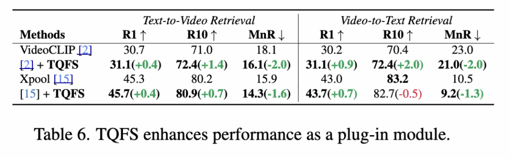 저자들은 마지막으로 UMIVR이 다양한 시나리오와 모달리티로 확장될 수 있는지를 검증했습니다. 먼저, TQFS 모듈이 다른 TVR 모델에도 그대로 붙여 사용할 수 있는지 확인하기 위해 VideoCLIP과 Xpool에 직접 적용한 결과, 두 모델 모두에서 Recall@10 기준 최대 +1.4%의 성능 향상과 MnR 감소를 보였습니다. 이는 TQFS가 별도의 학습 없이도 기존 비디오 검색 파이프라인의 품질을 안정적으로 개선해주는 범용적인 모듈임을 보여주었습니다.
