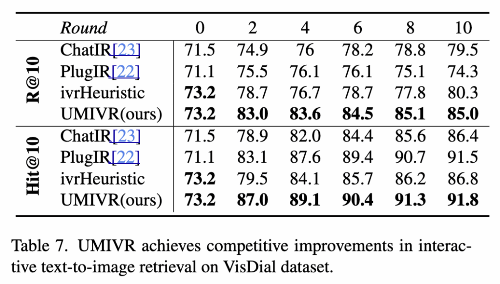 또한 UMIVR의 상호작용 구조가 비디오를 넘어서 이미지 Retrieval 영역에도 일반화되는지를 실험했습니다. 이를 위해 VisDial 데이터셋 기반의 text-to-image retrieval 환경에서 ChatIR, PlugIR, ivrHeuristic과 비교했고, UMIVR은 모든 interaction round에서 경쟁 기법들을 다 이겼다고 하네요. 특히 Recall@10과 Hit@10에서 뚜렷한 개선 결과를 보이며, UMIVR이 단순히 특정 비디오 데이터셋에 최적화된 방식이 아니라 대화형 검색 전반에 적용 가능한 강력한 불확실성 제어 프레임워크라고 주장합니다.