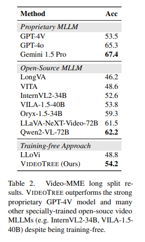마지막으로 Video-MME 데이터셋에서의 성능입니다. 기존 LVU 방법론인 LLoVi에 비해서 약 6퍼센트 정도의 성능 향상이 있었으며, 앞선 실험과 설명한 것과 같이 효율성도 더 뛰어납니다. VideoTree가 물론 다른 뛰어난 MLLM에 비해서는 성능이 좀 낮긴하지만, 효율적인 점 그리고, 성능이 크게 밀리지 않는 다는 점에서 VideoTree 방법론이 긴 영상에서 효과적이라는 것을 확인할 수 있습니다.