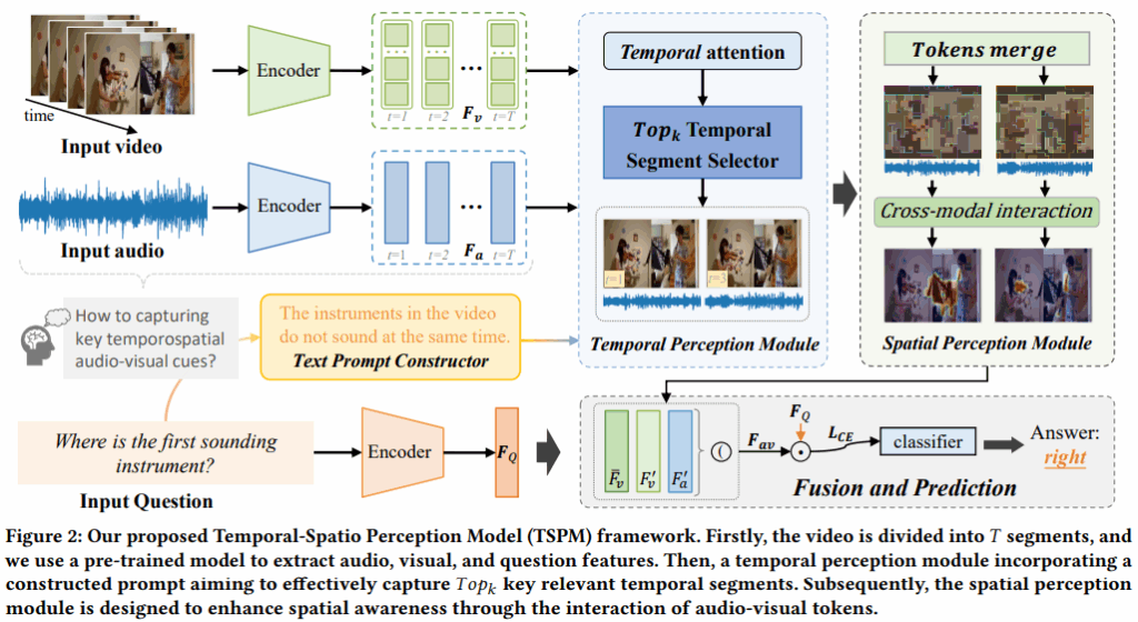 저자는 TSPM 이라는 Temporal-Spatial Perception Model 을 제안하고 이 모델의 목표는 질문에 관련이 있는 오디오 비주얼 인지하는 것이라고 합니다. 특히 사전학습된 visual-language 모델을 사용하여 non-declarative questions 를 visual representations 들과 같은 semantic space로 정렬하는 행위가 어렵다는 것을 알기 때문에 질문 template 으로부터 declarative sentence 프롬프트를 얻어서 사용한다고 합니다. 이렇게 되면 질문과 중요하게 연관된 부분을 찾기 쉬워진다고 하며 to assist the temporal perception module 이라고 표현합니다.