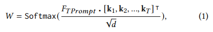 저자는 주어진 서술문 TPrompt 를 주어진 질문과 같은 인코더를 사용하여 feature 임베딩을 뽑게 되고 하나의 linear projection layer인 key(·) 를 통해 기존 비디오 feature 였던 를 k 로 인덱싱합니다. 아래의 수식을 통해 attention 가중치를 구하게 됩니다.