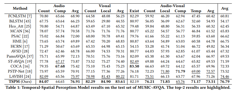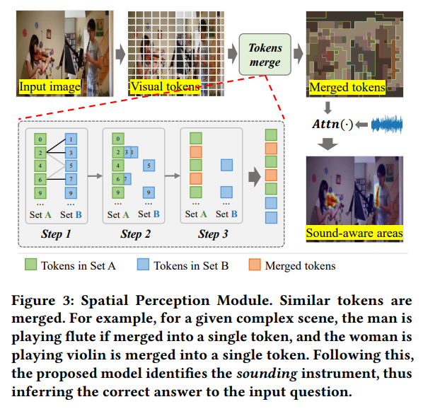 그리고 spatial perception module 은 visual 토큰들을 merge 하는 형태로 구현되었다고 합니다. 병합되는 부분들은 audio 에서의 정보를 토대로 sound-aware 인 지역들을 골랐다고 언급합니다. 결과적으로 temporal-spatial cues 들이 질문에 대답하기 좋은 형태로 묶이게 되고 이는 정량적 성능으로 입증했다고 하며 Absract 를 마칩니다.