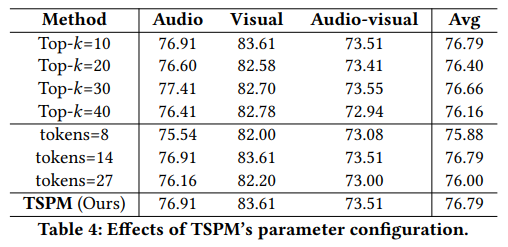 top k 방식의 프레임 셀렉션의 trade-off 를 저자가 해석한 내용은 구체적으로 존재하지는 않습니다. 다만 결과적으로 해석하기 나름이고 데이터셋이나 해당 task에 따라 다를 것 같습니다. token pruning 관점에서 모든 정보를 이용하는 것보다 적은 token 을 사용하면 성능이 보통 하락하는 것처럼 비디오의 프레임을 줄일수록 중요한 정보가 소실될 확률도 높아질 것입니다. 영상의 형태에 따라 다르겠지만 반복되는 프레임이 너무 많으면 정보의 redundancy가 높고 이런 경우라면 정보를 압축하는 방식이 성능을 오히려 올려줄 수도 있는 것입니다. MUSIC-AVQA 데이터셋은 모든 영상을 60프레임으로 사용했고 장면 전환이 보통 한번에서 많게는 두번 세번정도 존재하는 것으로 아는데, top k 방식같은 경우는 데이터셋과 task 에 어느정도 영향을 받을 수치라고 생각이 듭니다.