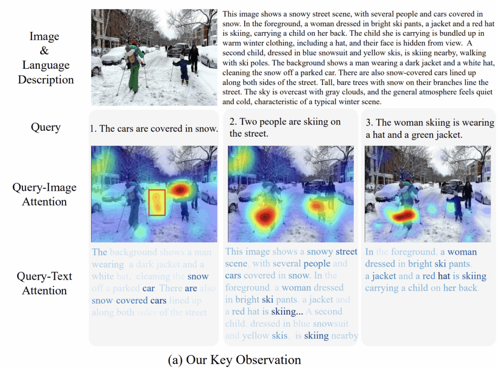 가장 큰 문제는 모델이 불필요한 저수준 시각 정보에 과도하게 주목한다는 점입니다. 그림 1(a)의 첫 번째 예시처럼, “눈에 덮인 차들”이라는 쿼리를 주었을 때 모델은 차보다 타이어 자국이나 배경 텍스처 같은 중요하지 않은 부분에 집중하는 모습을 확인할 수 있습니다. 이는 global contrastive learning 탓이라고 볼 수 있는데, 핵심 개념보다 주변 디테일을 더 크게 보고, 결국 검색 정확도를 떨어뜨리기 때문이죠.