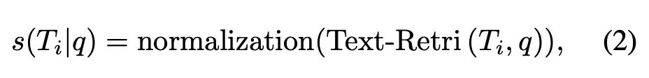 여기서 \text{Text-Retri} 는 off-the-shelf 텍스트 검색기(예: BM25, gemma2 retriever 등)를 이용해 쿼리와 후보 텍스트 묘사 간의 유사도를 계산하는 거라고 하네요. 즉, VISA는 이미지 → 텍스트 변환 후 기존 텍스트 검색 엔진의 강점을 가져오는 구조라고 할 수 있습니다 최종적으로 최적의 retrieval 결과는 두 점수를 합산해 결정합니다: