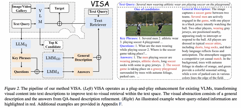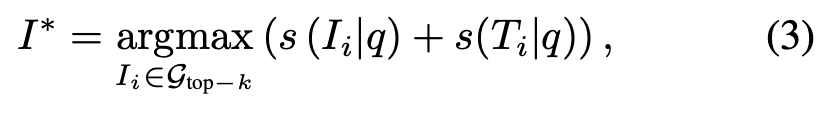 VISA는 이 문제를 “plug-and-play” 방식으로 해결했는데요, 바로 retrieval을 한 번 더 텍스트 공간에서 재정렬(reranking) 하는 것입니다. 즉, 먼저 기존 VLM으로 top-k 후보 \mathcal{G}_{top-k}를 뽑고, 그 다음 각 후보 이미지를 자연어 설명 T_i으로 바꿔 다시 텍스트-텍스트 매칭을 수행합니다.