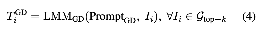 VISA는 먼저 top-k 후보 이미지 각각을 LMM을 통해 설명문 형태로 바꿔주는 과정을 거칩니다. 이때 생성되는 긴 문장 T_i^{GD}는 다음 수식처럼 이미지를 문장으로 변환하는 함수로 볼 수 있습니다: