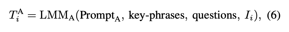 이 질문들은 명확히 답할 수 있어야 하고, 쿼리와 동일한 granularity를 유지해야 한다는 기준 아래 생성되며, LMM이 시각 정보만 보고 확실하게 판단할 수 있도록 설계되었습니다. 각 질문에 대해 후보 이미지 I_i를 보고 다시 LMM이 답변을 생성하면, 그 결과가 T_i^A로 기록됩니다: