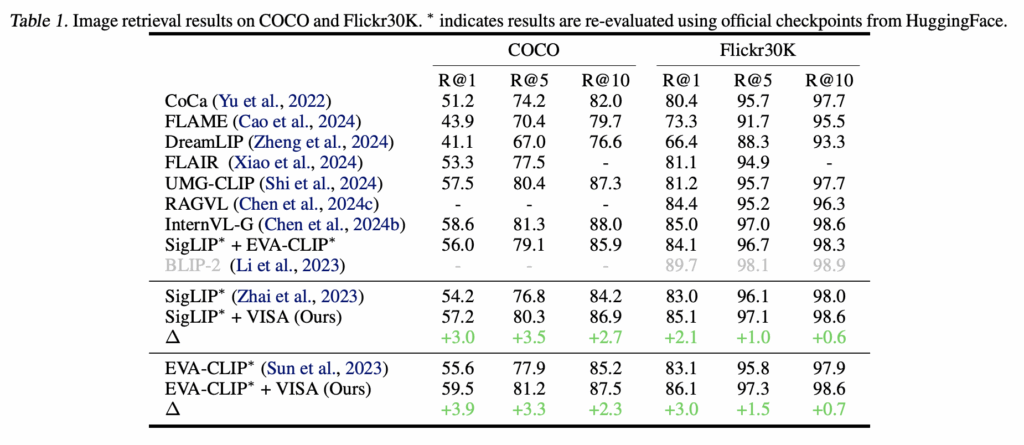 저자들은 MS-COCO와 Flickr30K에서 VISA를 평가했으며, 기존 VLM(SigLIP, EVA-CLIP)에 VISA를 단순히 덧붙이는 것만으로도 R@1 기준 COCO는 최대 3.9, Flickr30K는 최대 1.5의 성능 향상을 보였습니다. 이는 파라미터 수가 훨씬 큰 VLM을 단독으로 사용하는 것보다 더 높은 성능으로, VISA의 Abstraction이 단순 모델 확장보다 효과적이라는 점을 보여주는 결과라고 할 수 있습니다.