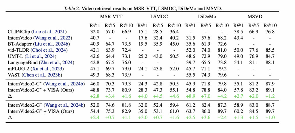 VISA는 InternVideo2-C(dual-stream)와 InternVideo2-G(single-hybrid) 두 가지 기반 모델 모두에서 일관된 R@1 향상을 보였습니다. 예를 들어 InternVideo2-C에서는 MSR-VTT 46.0→48.8%, LSMDC 24.3→28.3%, DiDeMo 45.9→54.8%로 상승하며, 특히 DiDeMo에서 8.9%라는 큰 성능 향상을 보였고, InternVideo2-G에서도 모든 데이터셋에서 고르게 성능이 향상되었죠