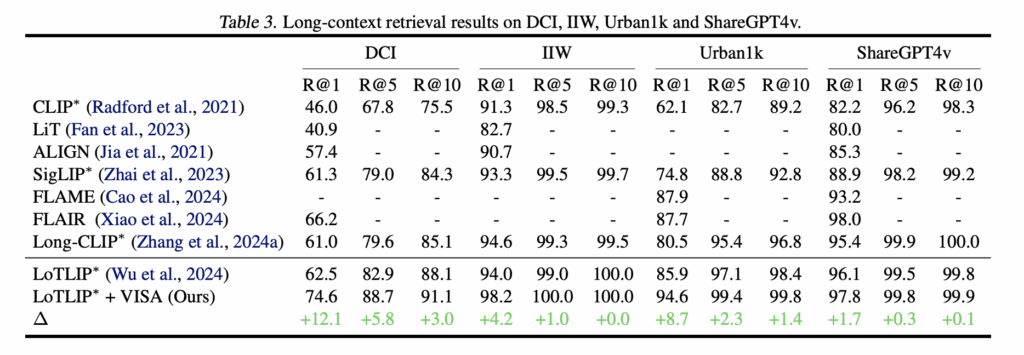 긴 context를 가진 쿼리에서도 세밀한 정보까지 처리할 수 있는지를 확인하기 위해, 네 가지 데이터셋(DCI, IIW, Urban1k, ShareGPT4v)에 대한 성능 평가도 수행하였습니다. 이 데이터셋들은 평균적으로 170토큰 이상의 descriptions부터 객체/위치/관계에 대한 라벨링이 있는 Urban1k까지, 다양한 granularity를 요구한다는 점이 특징이라고 하네요