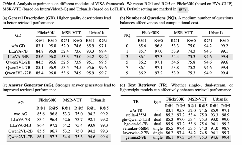 텍스트 설명을 생성하는 LMM의 품질이 높을수록 검색 성능도 함께 향상했습니다. 작은 모델(LLaVA-7B, Qwen2VL-2B)도 이미 의미 있는 성능 향상이 있었고, 모델 규모가 커질수록 더 풍부하고 정확한 설명을 생성해 검색 성능이 지속적으로 높아졌습니다.