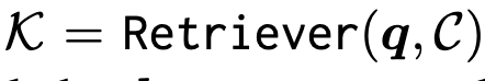 수식으로 살펴보면 질의 q가 주어졌을 때 retrieval 모듈을 사용하여 외부 코퍼스 C로부터 질의와 관련된 문서(또는 지식 단위) 집합 K={k1,k2,…,kk}(이는 문서단위라고 이해하시면 됩니다.) 를 검색합니다.