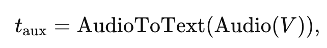여기서 Audio(V)는 비디오 V로부터 오디오를 추출하는 연산이고, AudioToTex는 추출된 오디오를 텍스트로 변환하는 ASR 모듈을 의미합니다. 그리고 원래 비디오에 자막 t가 존재하지 않는 비디오의 경우 오디오로 생성하는게 아니라 원래 자막을 보조 텍스트로 활용합니다.