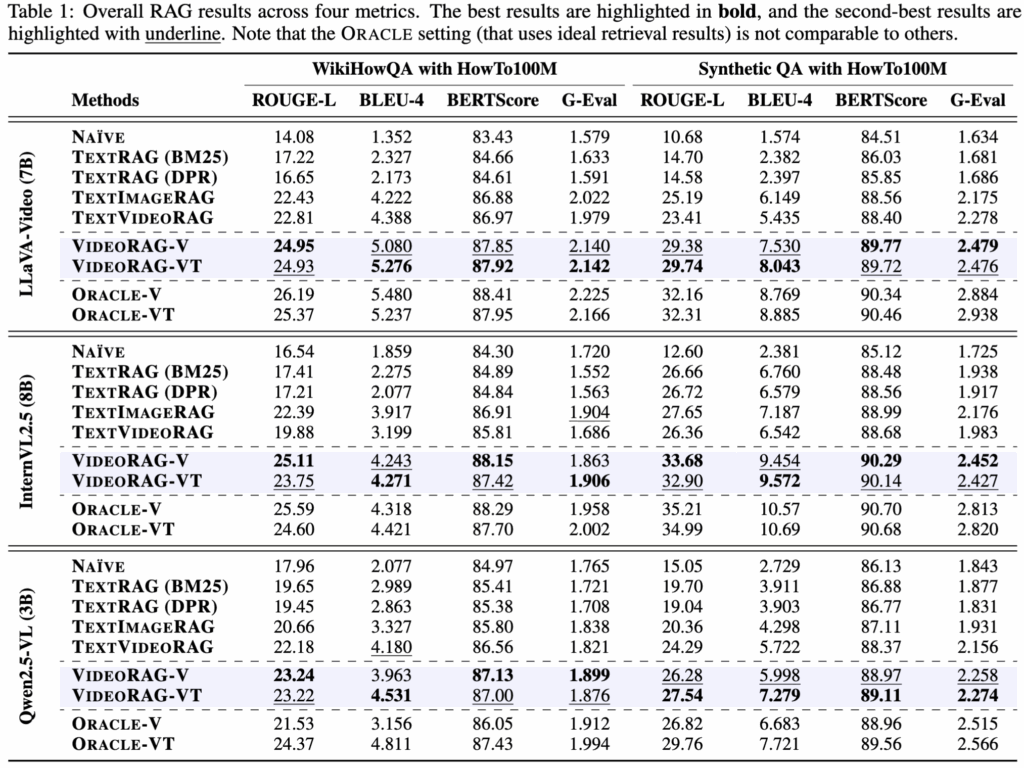 먼저 Table 1의 결과를 살펴보면 모든 RAG 모델이 NAÏVE 베이스라인보다 높은 성능을 보이며 답변을 생성할떄 외부 지식을 활용하는 것이 정확도를 높일 수 있다는 것을 확인할 수 있습니다. 그리고 저자가 제안하는 VIDEORAG는 기존의 텍스트 기반, 텍스트-이미지 기반, 텍스트-비디오 기반 RAG 베이스라인들을 높은 성능을 보이고 있습니다. 저자는 추가적으로 RAG에서 비디오만 사용하는 VIDEORAG-V와 비디오와,텍스트를 모두 활용하는 VIDEORAG-VT 의 성능도 리포팅하는데 답변을 생성할때 비디오의 시각적 특징만으로도 정확도 향상에 도움이 되는 것을 확인할 수 있습니다.
