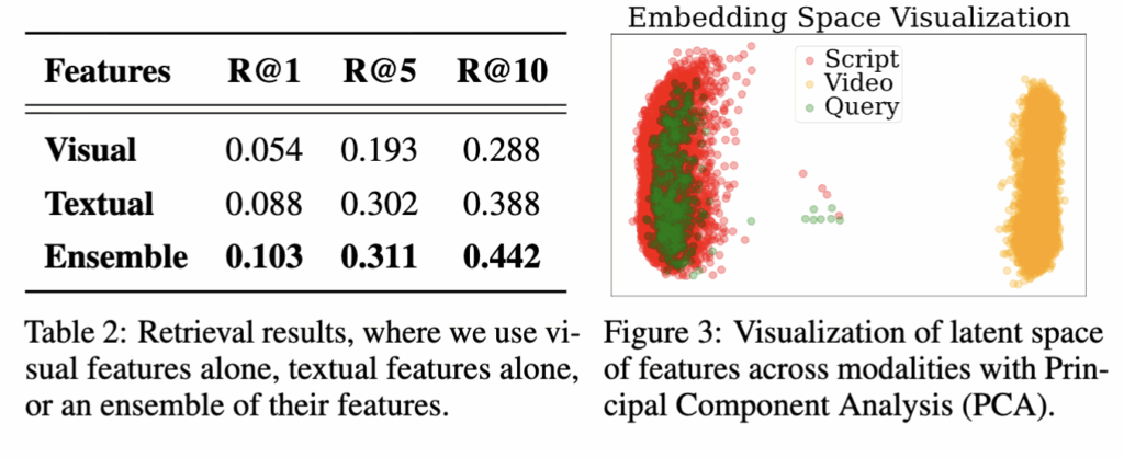 위 테이블 2에서는 비디오 검색을 할 때 텍스트, 시각, 이 둘의 결합하여 retrieval 결과를 비교합니다. 실험 결과, 텍스트 특징이 시각 특징보다 더 좋은 성능을 보이는데, 이는 사용자 질의와 더 강한 semantic aligㅁnment을 이루기 때문인 것 같다고 저자는 분석하고 있습니다. 그리고 Figure 3에서 비디오,자막,쿼리를 임베딩 상에 시각화하였습니다. 보는 것처럼 비디오 특징보다 비디오의 텍스트(자막)이 임베딩 상에 쿼리와 더 근접하고 비디오 특징은 쿼리와 모달리티 갭이 있어 검색 성능이 최적에 미치지 못하는 것을 알 수 있습니다.